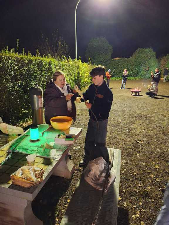 Dort wurden die Kinder mit einer großen Martinsbrezel und einem Erfrischungsgetränk belohnt. Elvira Kuske, die Jugendvertreterin hatte wieder wie jedes Jahr das bei den Kindern so heißbegehrte Stockbrot vorbereitet. Das konnten sie an einem eigenen kleinen Feuer rösten. Und wir wissen, dass einige Kinder hauptsächlich für dieses Stockbrot kommen.